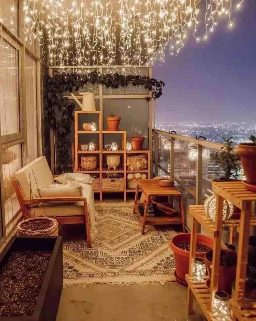 Once you have your seating situated, layer outdoor pillows with various colors and textures to make the area look more cozy and inviting for your guests. Then add string lights, candles, and lanterns for a soft boho look.